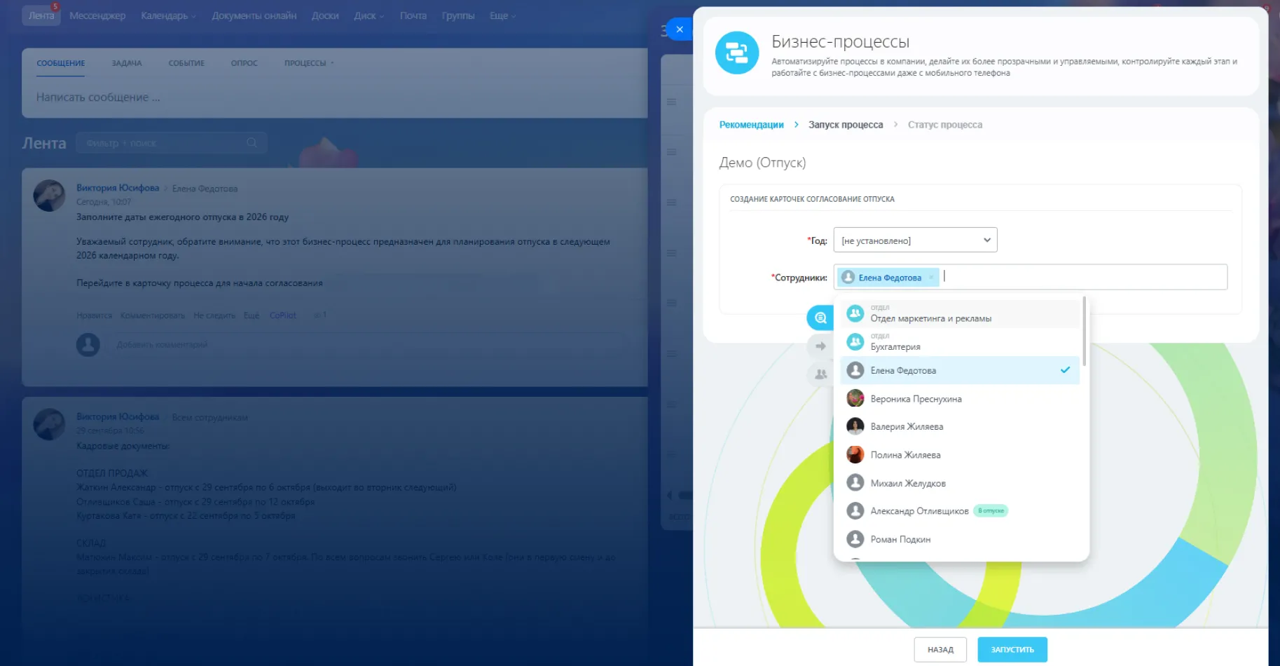 1. HR-менеджер запускает единый бизнес-процесс — «Демо отпуск» — и выбирает сотрудников, которым нужно согласовать отпуск (вся компания или, например, только новички).