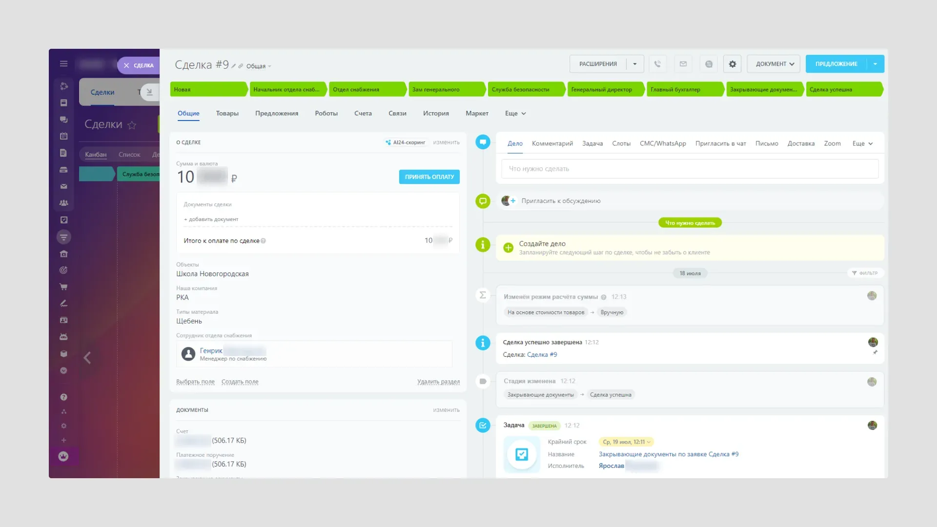 После всех согласований, счет попадает к главному бухгалтеру, которая осуществляет оплату и подгружает платежное поручение. После отгрузки материала - сотрудник отдела снабжения, у кого была в работе заявка подгружает скан закрывающего документа. Заявка закрыта.