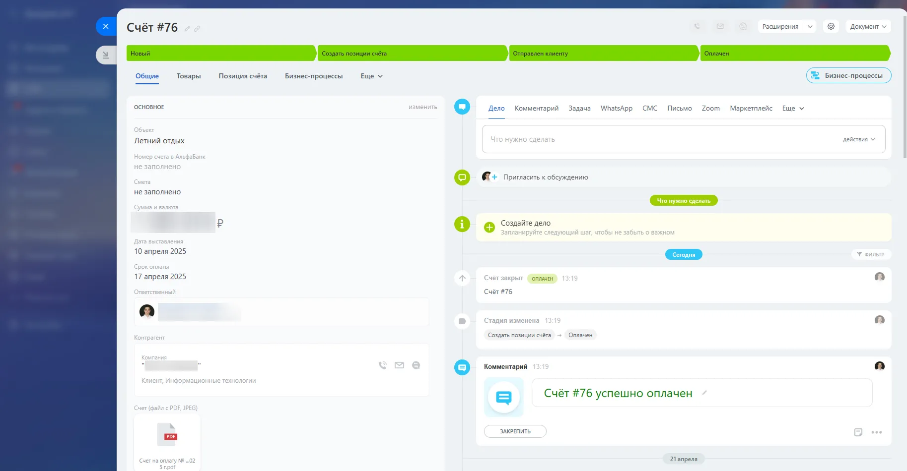 На этапе презентации функционала клиент обратил внимание: удобнее работать, если оплаченный счёт с отметкой банка будет автоматически подгружаться в карточку сделки. Мы внесли эту доработку: теперь скан документа попадает в CRM после подтверждением оплаты, без ручной загрузки. В итоге мы построили сквозной процесс: