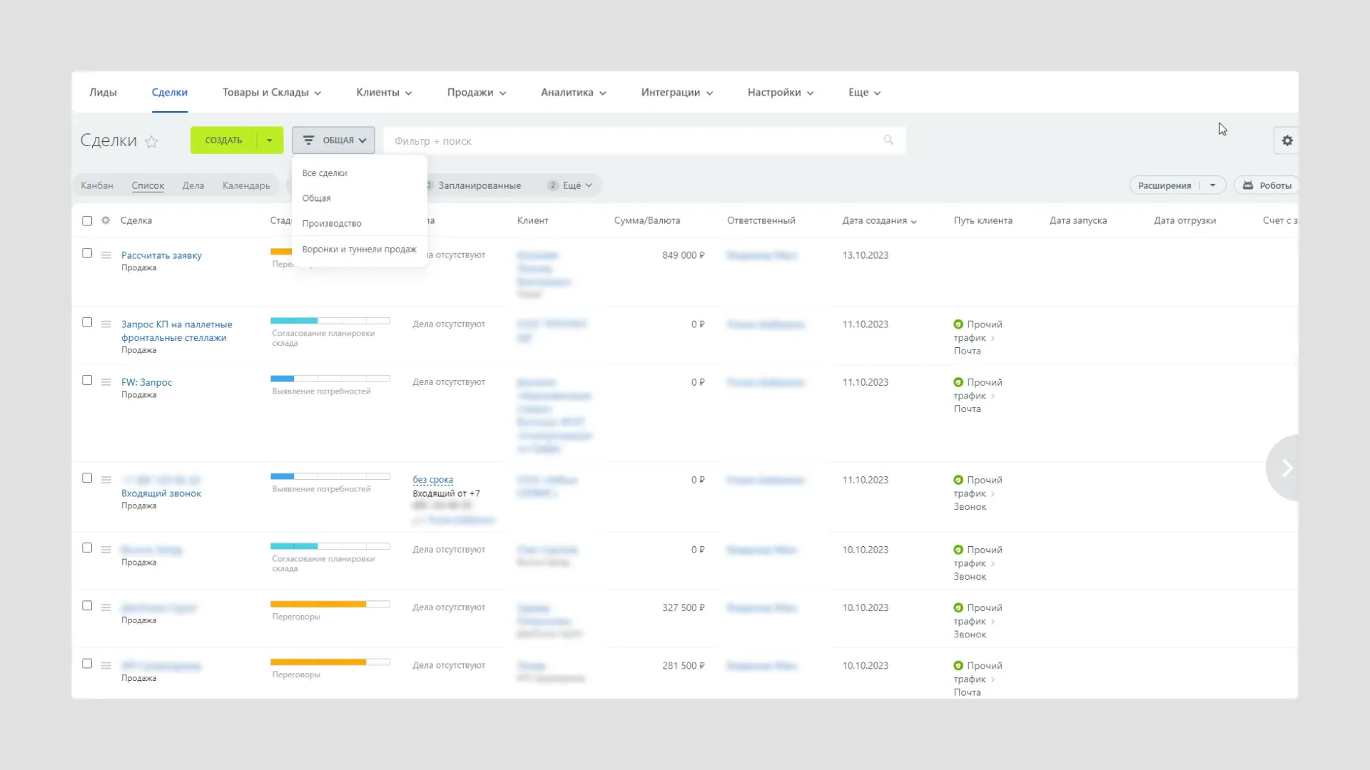 Главной задачей первого этапа было организовать работу отдела продаж и ведение производства. Реализовали через воронки продаж. Выбрали классический режим работы CRM. Все входящие обращения попадают сначала в лиды, а успешный лид конвертируются в сделку и клиента.