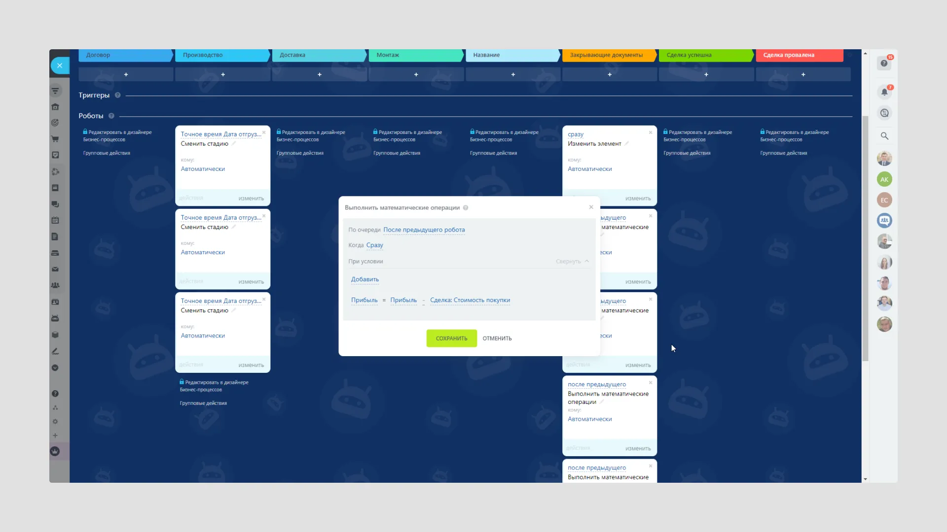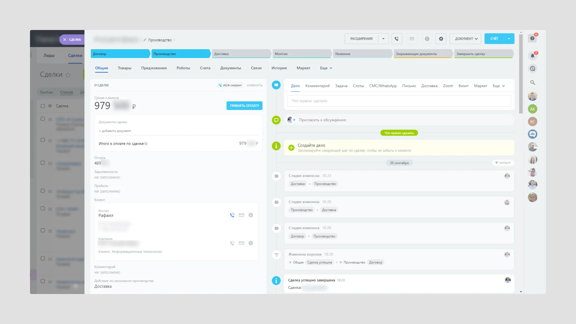 Во второй настроенной воронке ведется работа над задачами, связанными с оказанием услуг и документооборотом — заключение договора, производство на стороне завода, доставка, монтаж и сбор закрывающих документов.