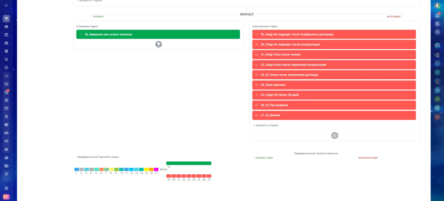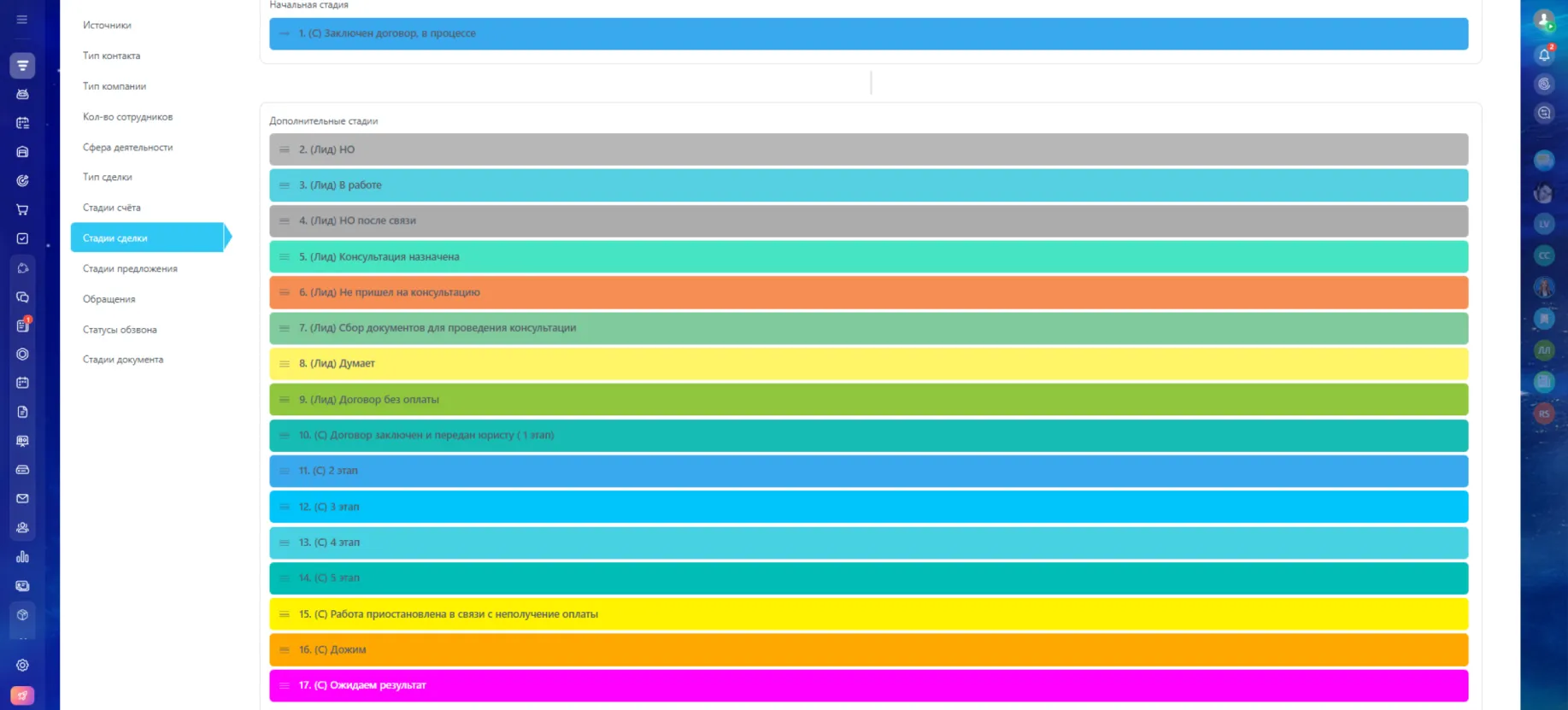 Сейчас воронка сделок включает в себя стадии из старой структуры. Это переходный этап: мы сделали так, чтобы старые сделки со своими уже настроенными автоматизациями не потерялись при переносе. Как только эти карточки закроются, мы уберем лишние стадии и оставим только новую чистую структуру.