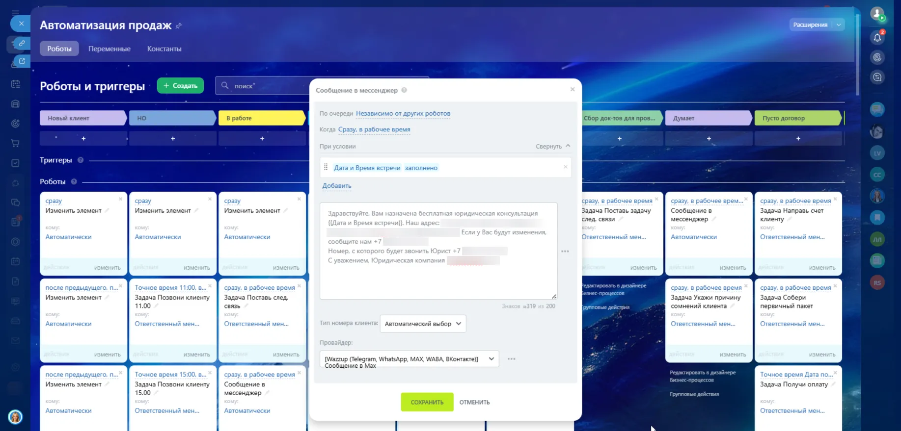 Чтобы воронка не забивалась, мы установили лимит времени на обработку. Если спустя 120 часов стадия не изменилась (клиент не вышел на связь), карточка автоматически переезжает в статус «Отказ».