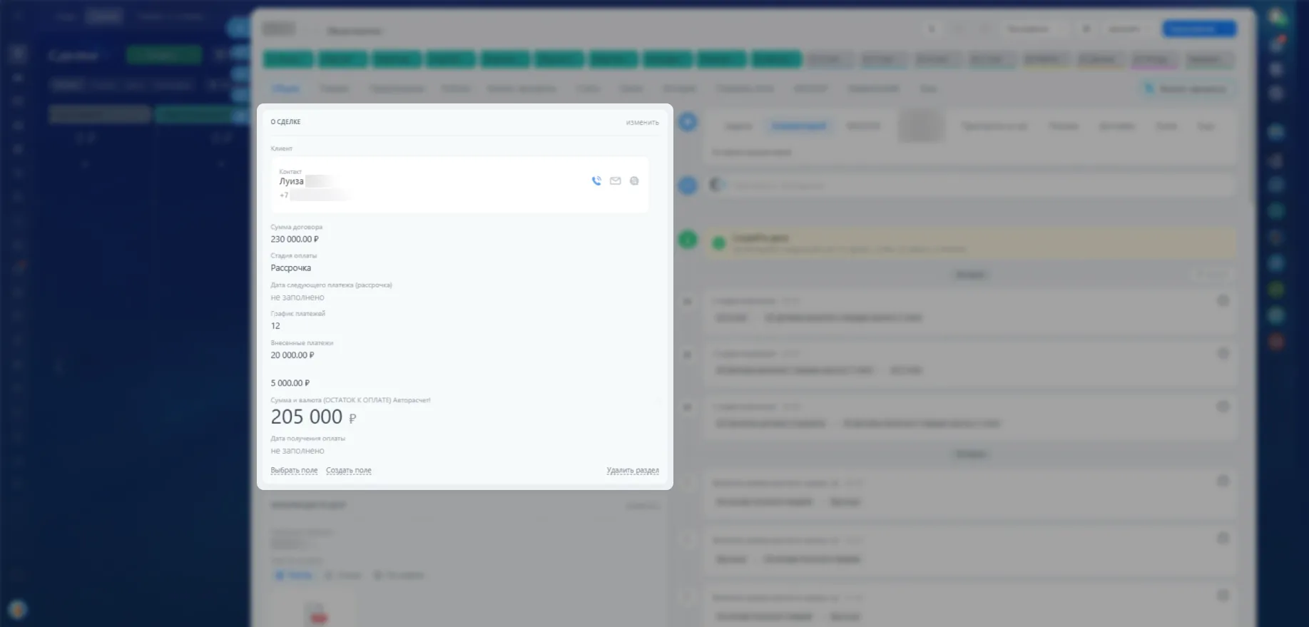 Чтобы менеджер сразу видел сумму к оплате по каждой сделке, а не просто общую сумму договора, мы настроили три связанных поля (в денежном формате):