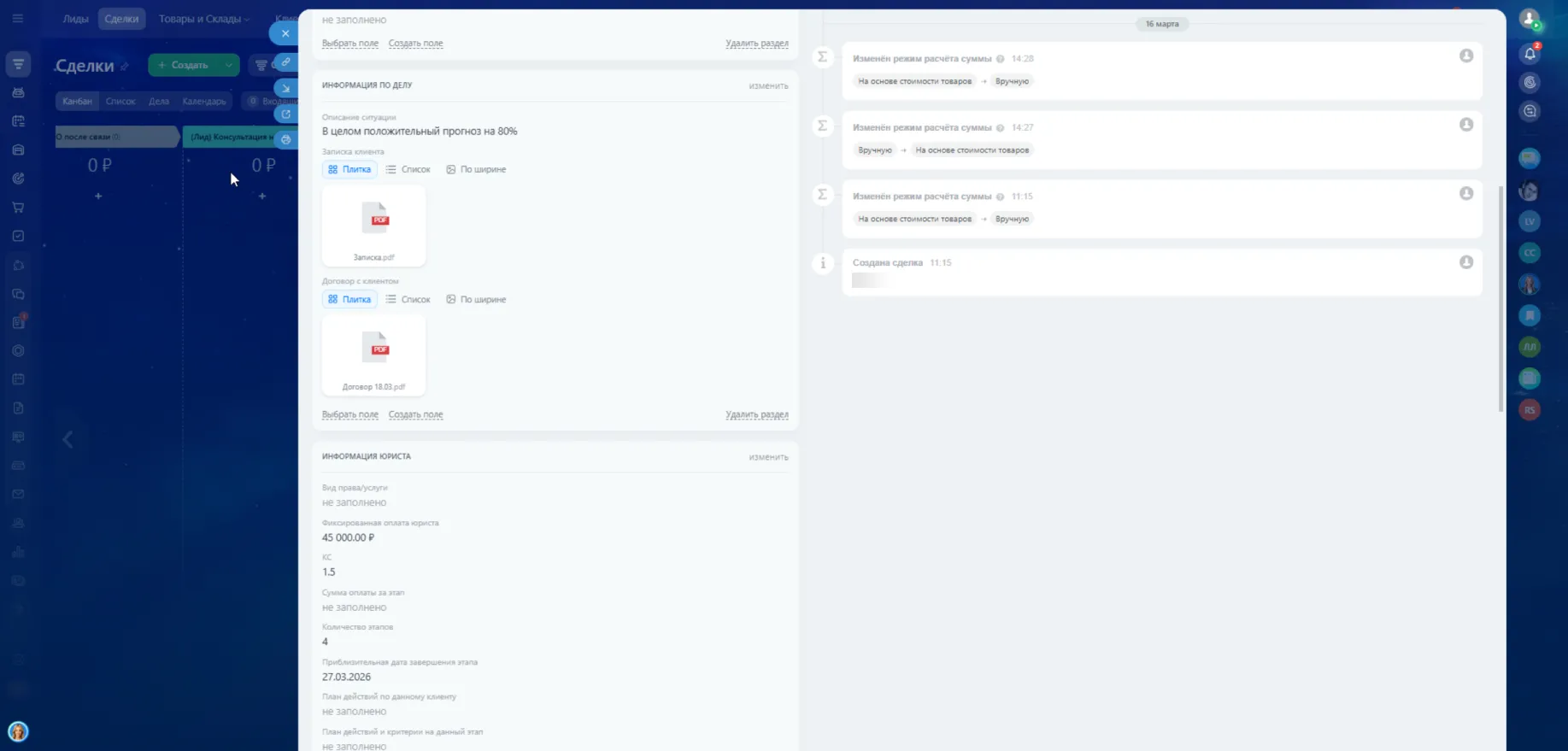 В планах дальнейшей доработки системы — настроить автоматический расчет вознаграждения юриста прямо в CRM на основе данных из этого блока.
