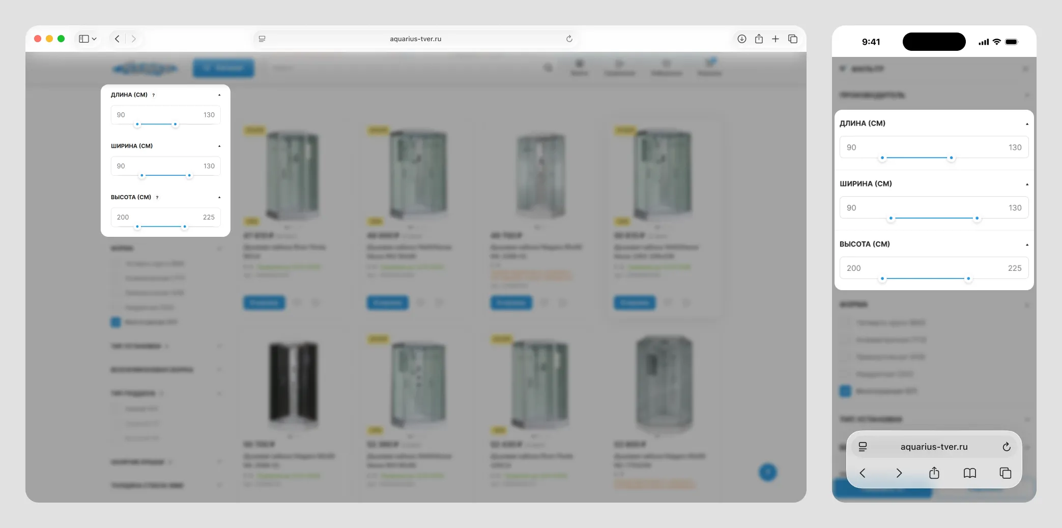 В стандартном решении слайдеры диапазонов — например, размеров товара — охватывают весь возможный интервал, даже если после выбора других параметров в этом диапазоне нет доступных товаров. Мы изменили логику так, чтобы при любой фильтрации ползунки мгновенно сужались до актуального минимума и максимума.