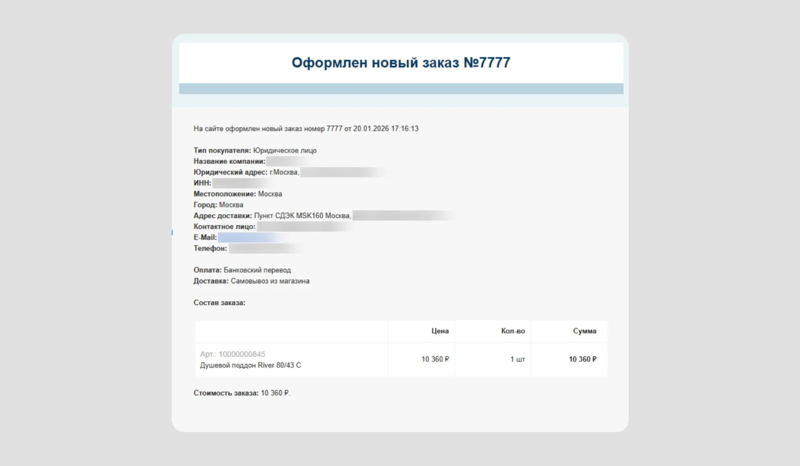 Мы полностью переработали систему уведомлений, чтобы клиент всегда знал, что происходит с его заказом. В каждом письме отображается полный состав заказа с ценами и итоговой суммой, а также релевантная информация по заказу в зависимости от: