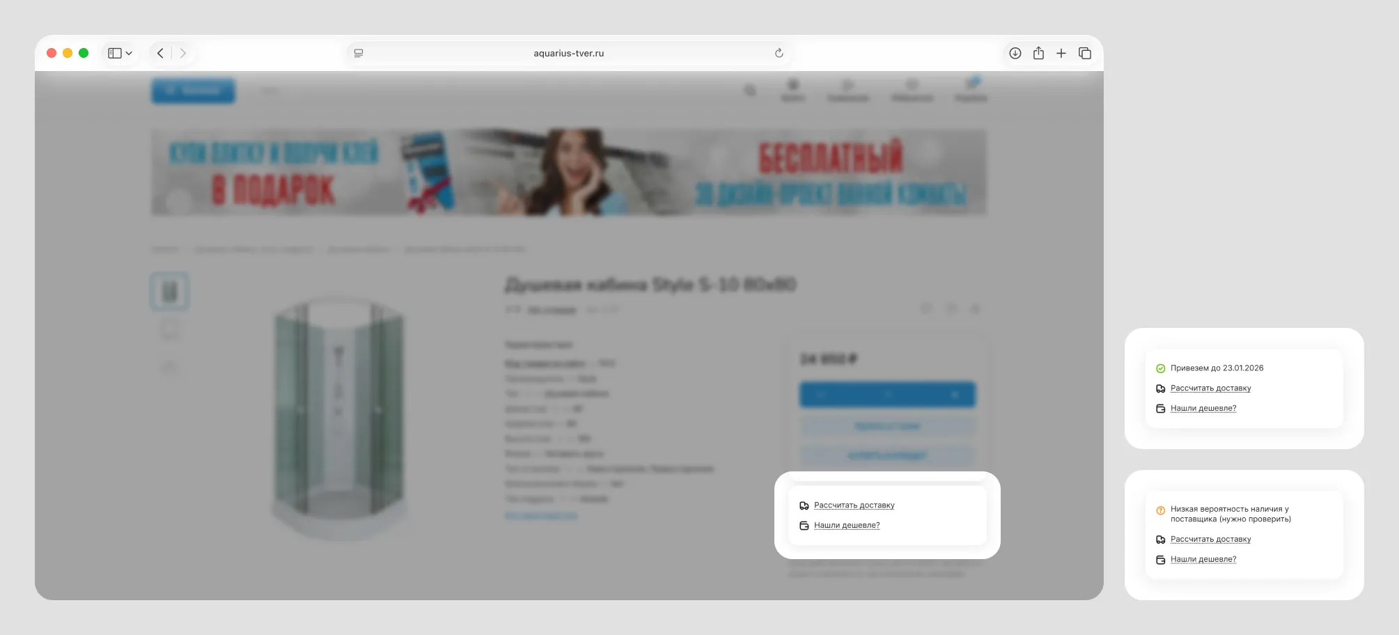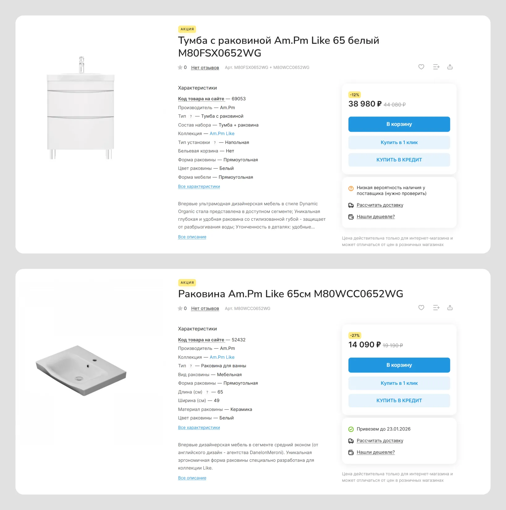 Стандартный функционал Битрикс не справляется с правильным отображением цены комплекта товаров, когда хотя бы к одному из них применена скидка. Благодаря нашей доработке, цена комплекта всегда отражает реальные розничные цены и действующие скидки на входящие товары. Если на один из товаров (например, тумбу под раковину) установлена скидка, она автоматически учитывается в общей стоимости комплекта: посетитель увидит перечеркнутую старую цену, новое значение и правильный размер скидки.