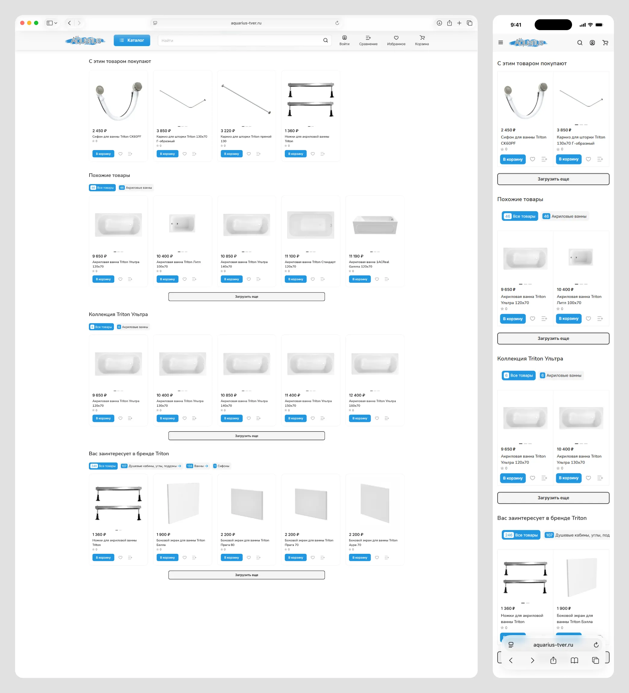 При этом внутри подборок по бренду и коллекции мы добавили навигацию по категориям через теги. Теперь покупатель может быстро переключиться в рамках одной коллекции или бренда между «ваннами», «раковинами» и «унитазами», а затем — между «акриловыми», «чугунными» и «стальными» ваннами. Это превращает рекомендации в удобный инструмент быстрого поиска, особенно полезный при работе с большими каталогами.