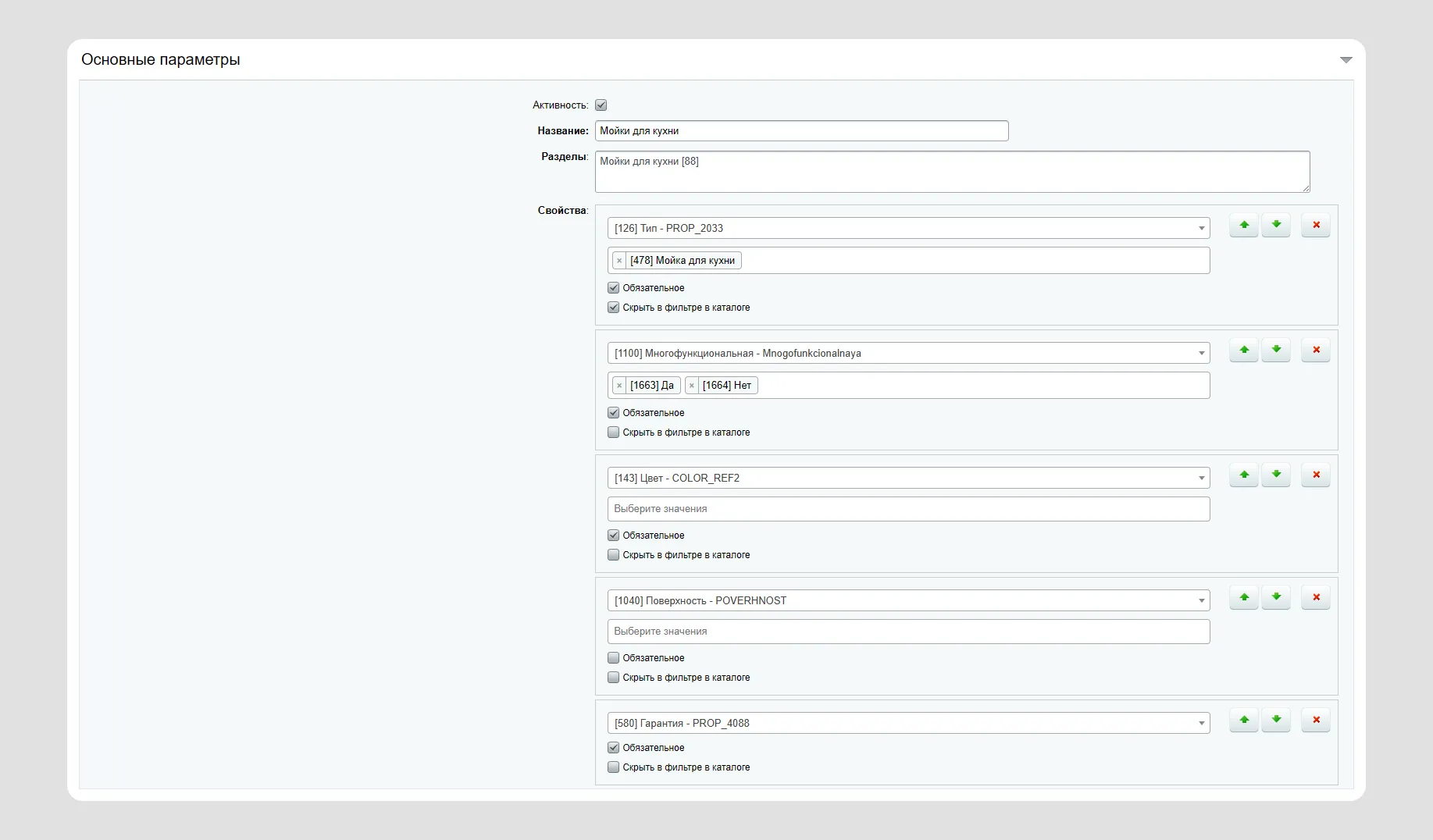 Настроили гибкую систему управления свойствами, привязанную к структуре каталога. Теперь при добавлении или редактировании товара контент-менеджер видит только те поля, которые актуальны для конкретной категории, например: