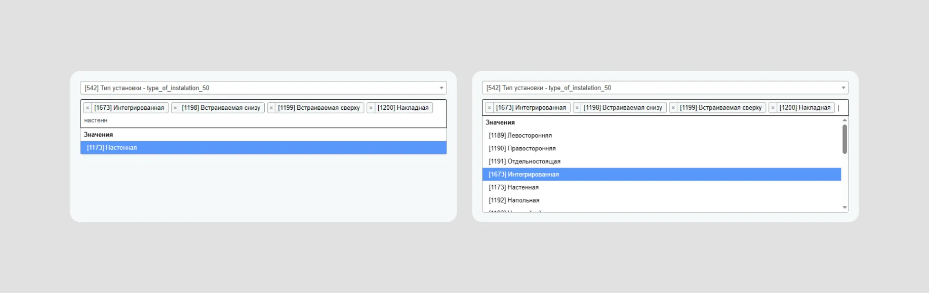 Ограничили список допустимых значений для каждого свойства и добавили поиск внутри выпадающего списка: например, для цветов, материалов или типов монтажа. Теперь контент-менеджеру не нужно прокручивать десятки позиций, чтобы найти нужное значение, и сразу видно, какие варианты уже выбраны.
