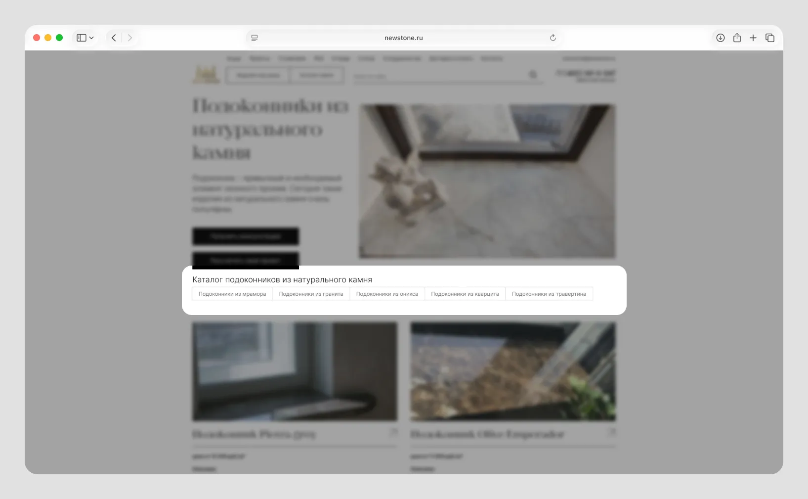 На каждый раздел из каталога «Изделия из натурального камня» мы добавили блок кнопок под заголовком страницы, например: «Столешницы из мрамора», «Столешницы из гранита», «Столешницы из кварцита».