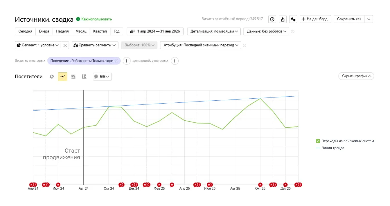 Основной целью работ стало удержание стабильного органического трафика на фоне ожидаемого снижения спроса и смягчение сезонных просадок.