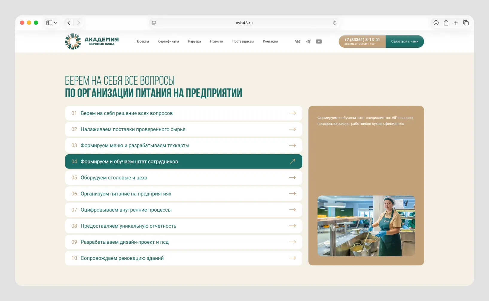 На главной странице разместили блок «Берем на себя все вопросы по организации питания на предприятии». Здесь мы показали реальный процесс взаимодействия с клиентом: от первой заявки до запуска питания на объекте.