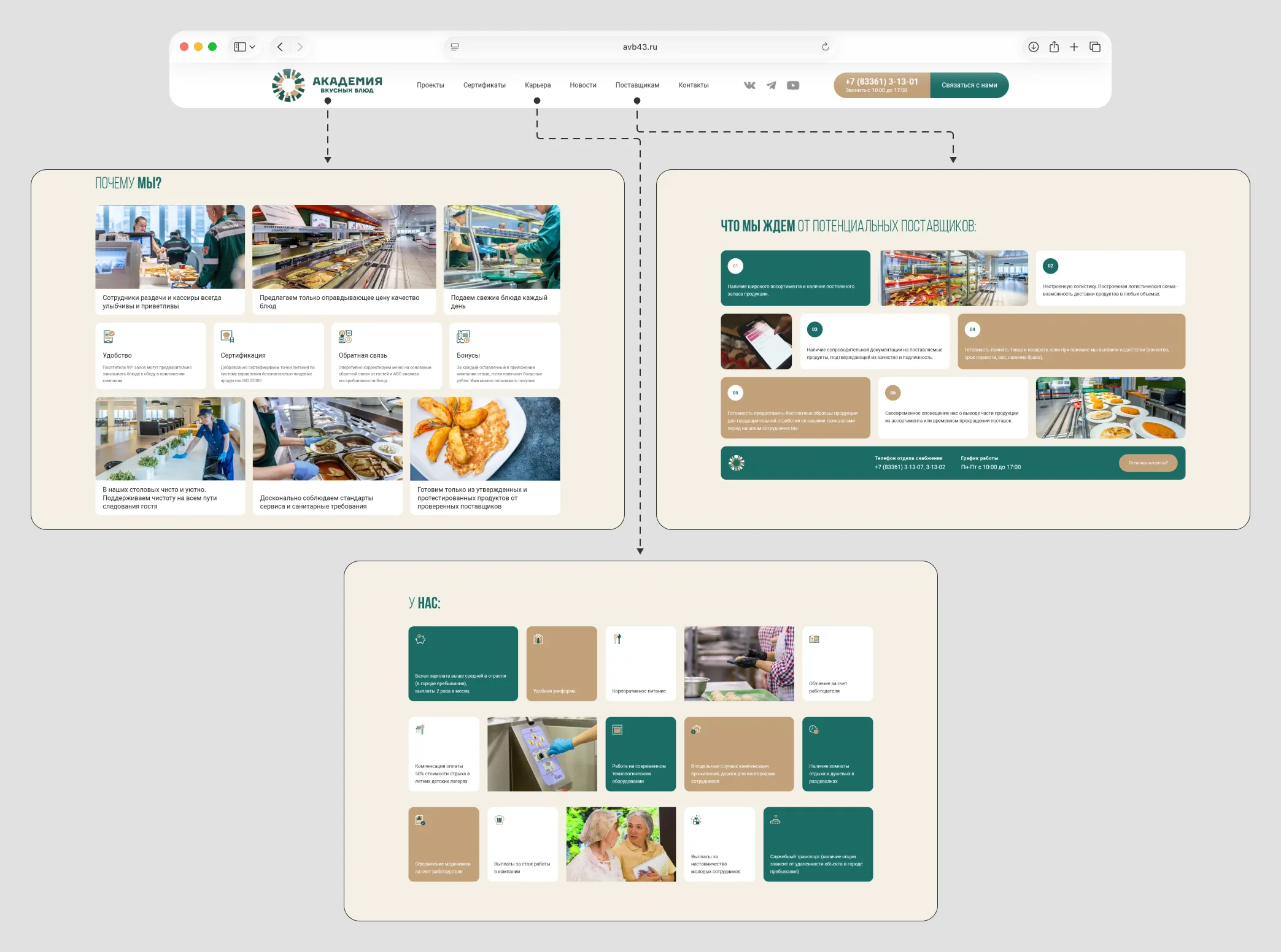 После серии встреч с клиентом мы детально разобрали пользовательские сценарии и сформировали логику нового сайта «Академии вкусных блюд», которая учитывает интересы трёх целевых групп. Разделение потоков реализовали на уровне навигации и разделов: