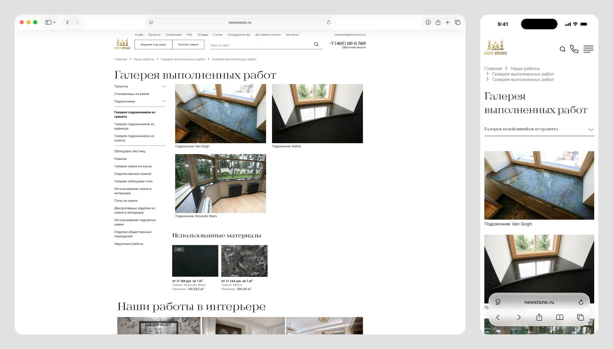 Наша разработка заложила крепкий технологический фундамент, на котором бизнес Newstone может расти. Новая CMS, современный дизайн и логика каталога решили накопившиеся проблемы старого сайта и дали команде инструмент для самостоятельной работы. А главное — сайт начал работать на маркетинговую стратегию: привлекать клиентов, которые хотят не просто купить камень, а получить готовое решение под ключ. На этой основе можно запускать SEO и контекст: сайт технически исправен, адаптирован под мобильные, имеет ЧПУ-фильтры и быструю загрузку — всё, что нужно для эффективного продвижения.