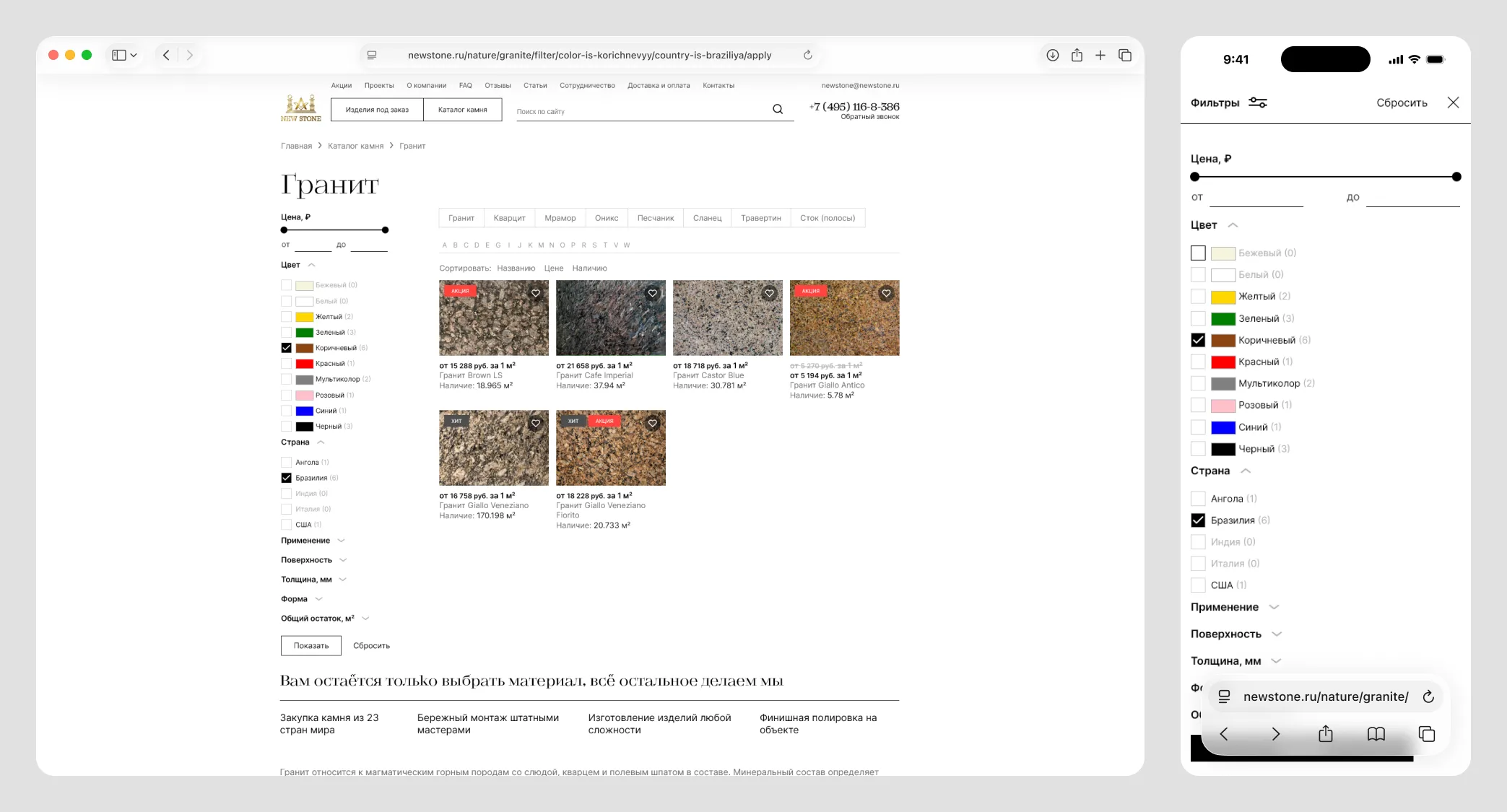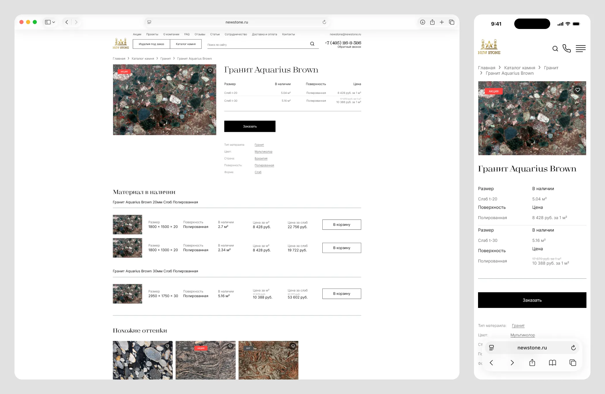 Посетитель сайта получил современный адаптивный интерфейс — все элементы корректно отображаются на смартфонах и планшетах. Удобный фильтр позволяет быстро найти камень по параметрам (порода, происхождение, цвет, размер), а группировка товаров в карточке помогает сравнивать разные слэбы одной породы без перехода между страницами. Интеграция с 1С обеспечивает актуальность данных: клиент видит реальное наличие и цены, без ситуаций «ой, это уже подорожало, а это распродали».