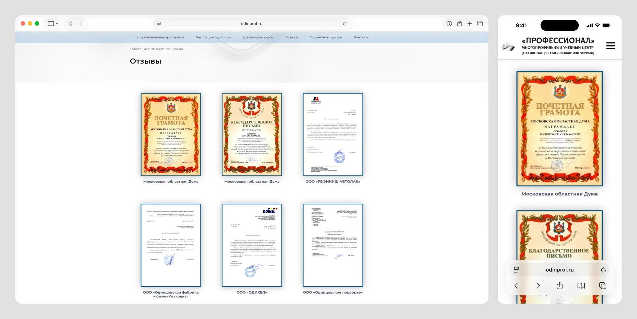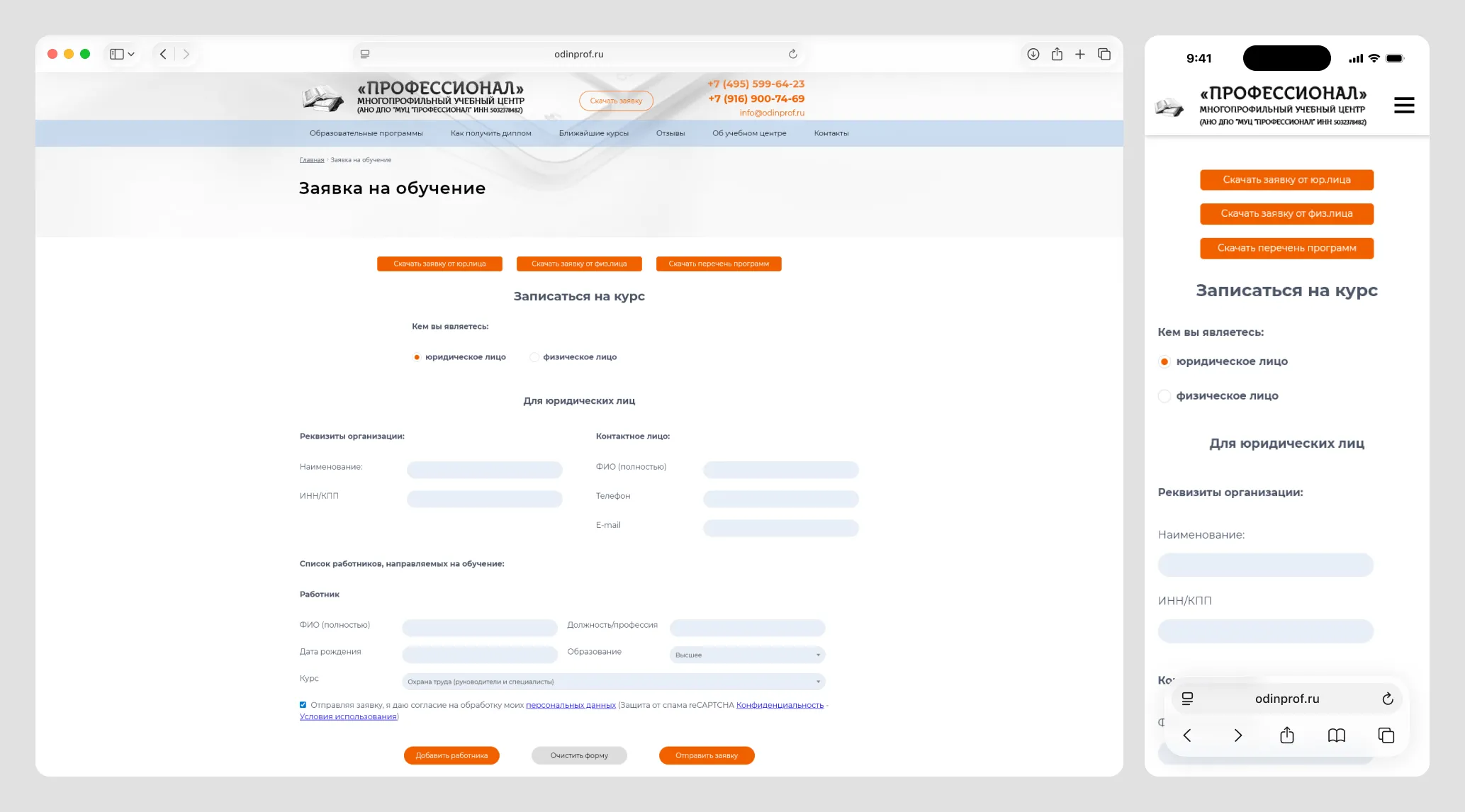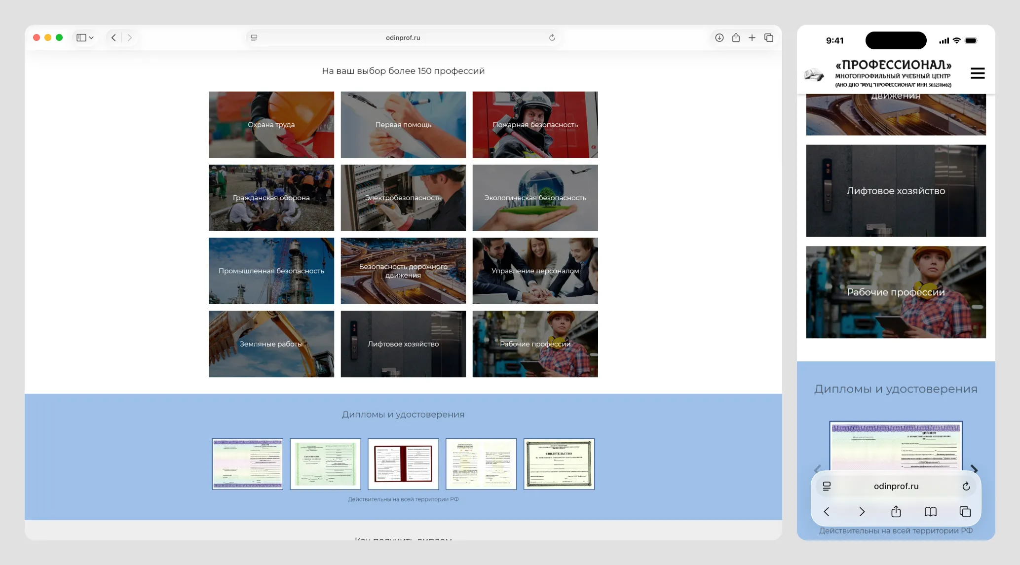 Учебный центр ДПО «Профессионал» (г. Одинцово) специализируется на подготовке и переподготовке специалистов по рабочим профессиям, промышленной безопасности и управлению персоналом. На момент обращения у клиента был только морально устаревший одностраничник-«визитка». Такой ресурс не мог эффективно привлекать клиентов: отсутствовали форма заявки, информация о лицензиях и документах центра, описания обучающих программ.