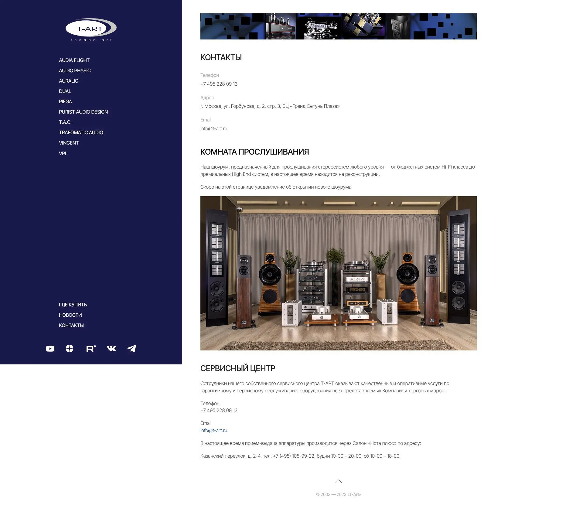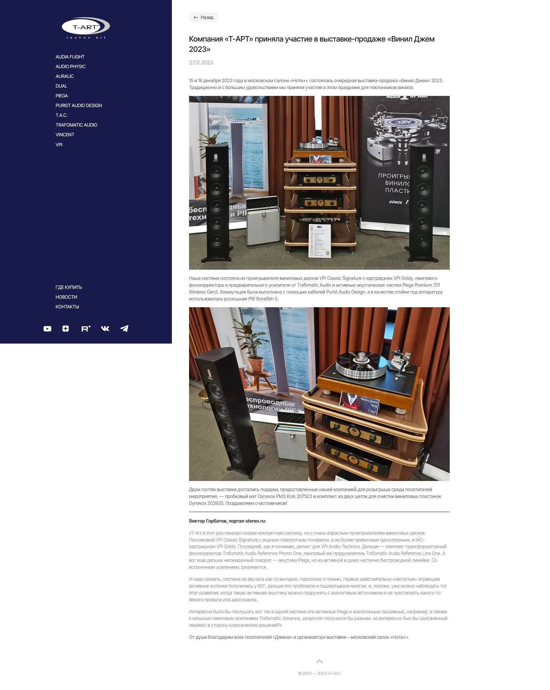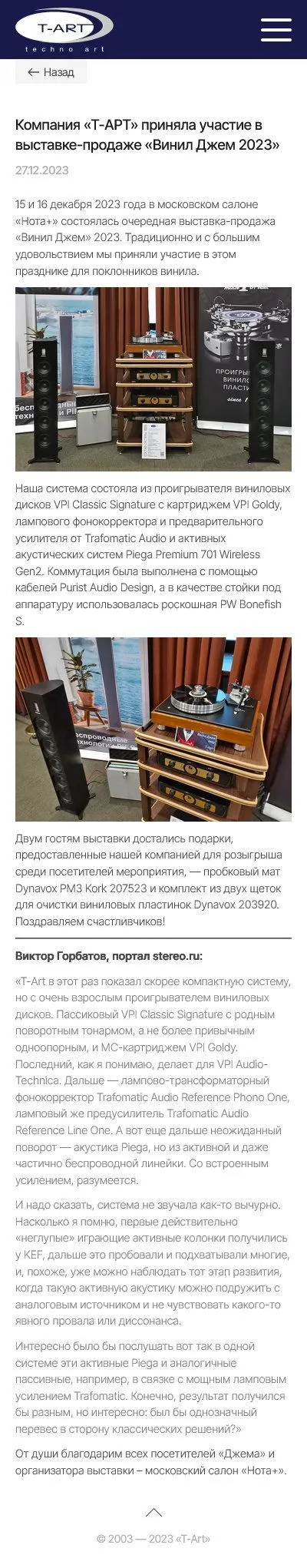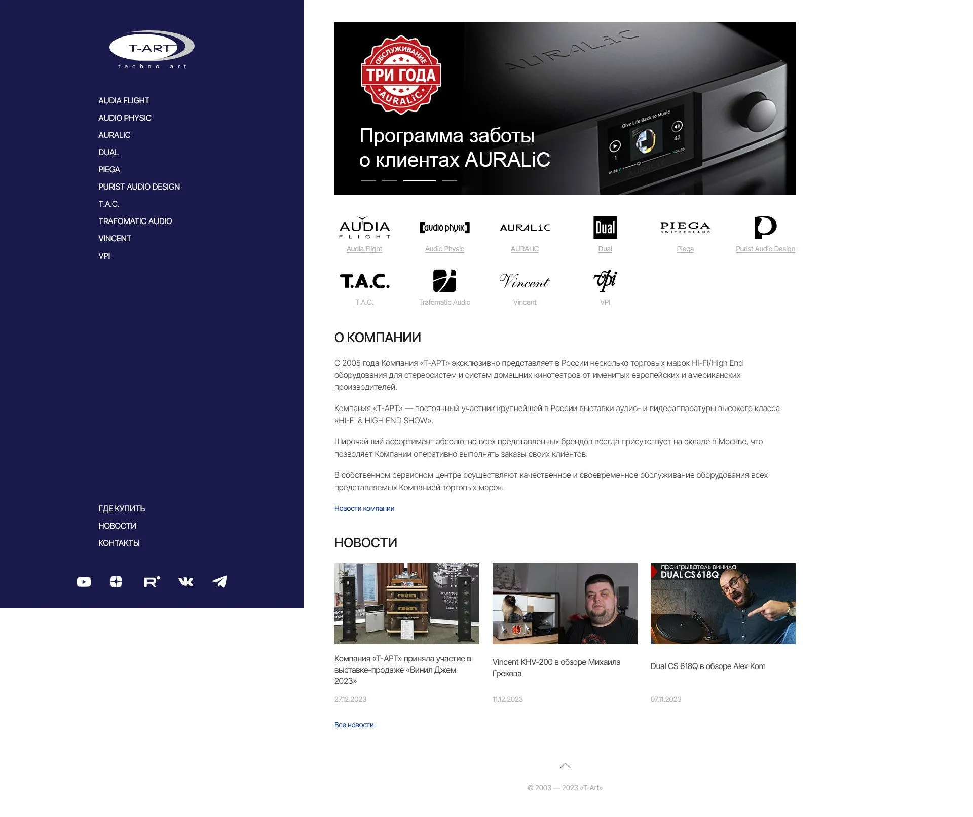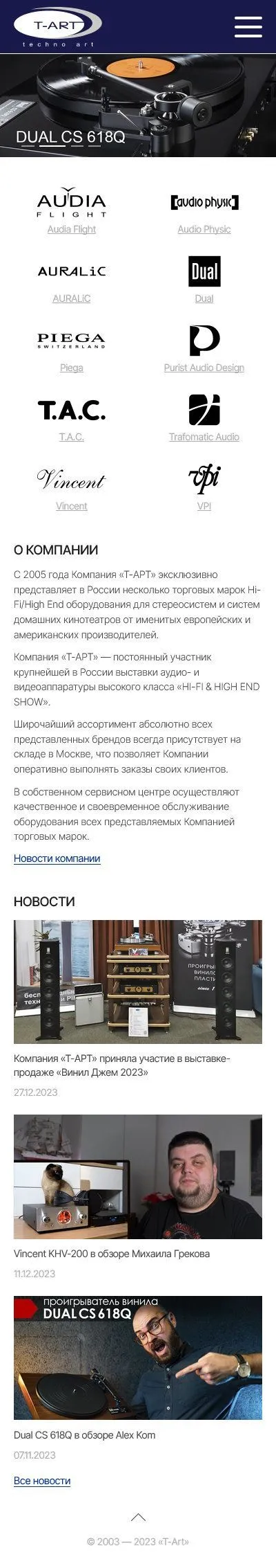 T-art.ru — компания Hi-Fi/High End оборудования для стереосистем и систем домашних кинотеатров от именитых европейских и американских производителей, постоянный участник крупнейшей в России выставки аудио- и видеоаппаратуры высокого класса «HI-FI & HIGH END SHOW».