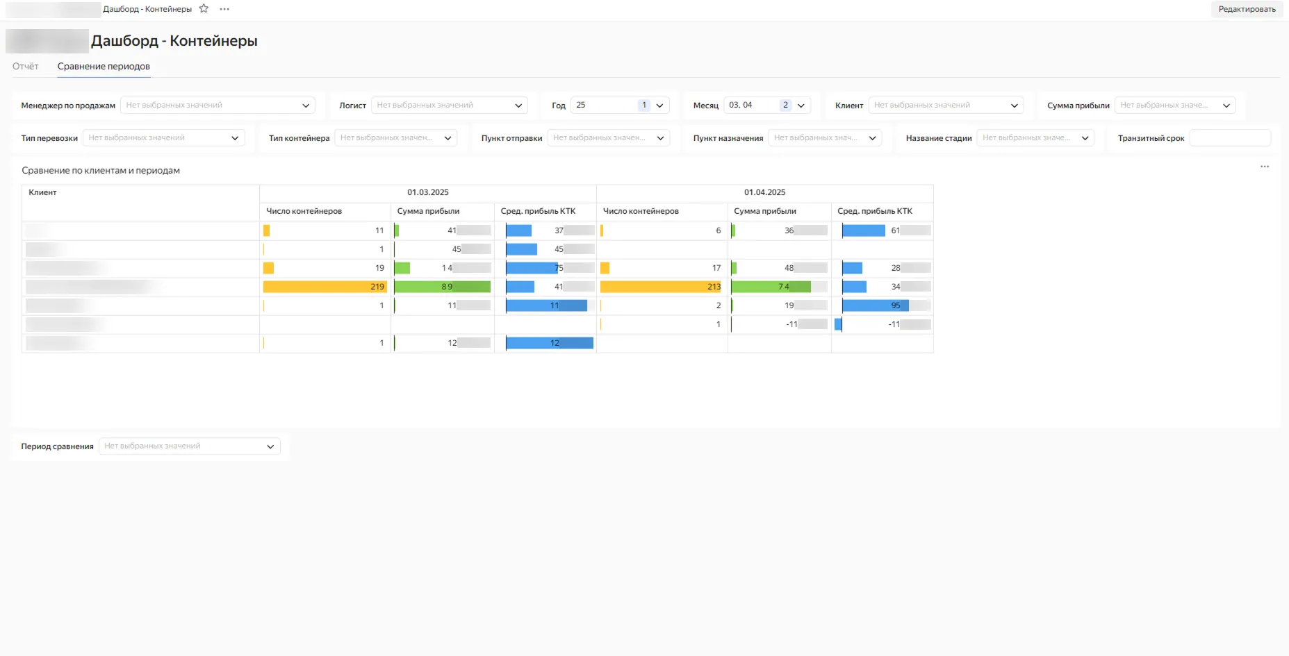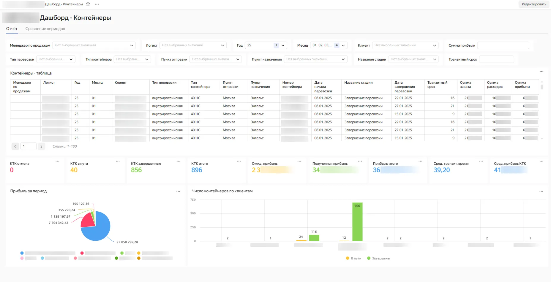 Позволяет изучать данные за выбранный период (месяц, квартал, год и пр.) с возможностью фильтрации по более 10 параметрам, например: сотрудник, клиент, тип и стадия перевозки, вид контейнера.